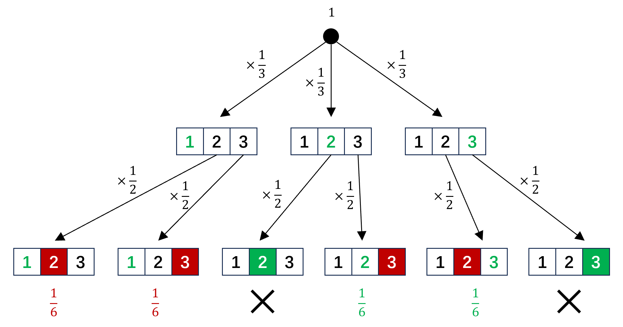 可以看到换门没有汽车的概率是 $\frac{1}{6}+\frac{1}{6}=\frac{1}{3}$,换门得到汽车的概率是 $\frac{1}{3}+\frac{1}{3}=\frac{2}{3}$。
